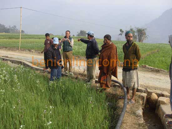 कृषि बिकास कार्यालयबाट आएका अधिकृतहरूलार्इ बालीमा देखिएको प्रकोपका बारेमा जानकारी गराउँदै स्थानीयबासी तस्बीरः बेनीअनलाइन