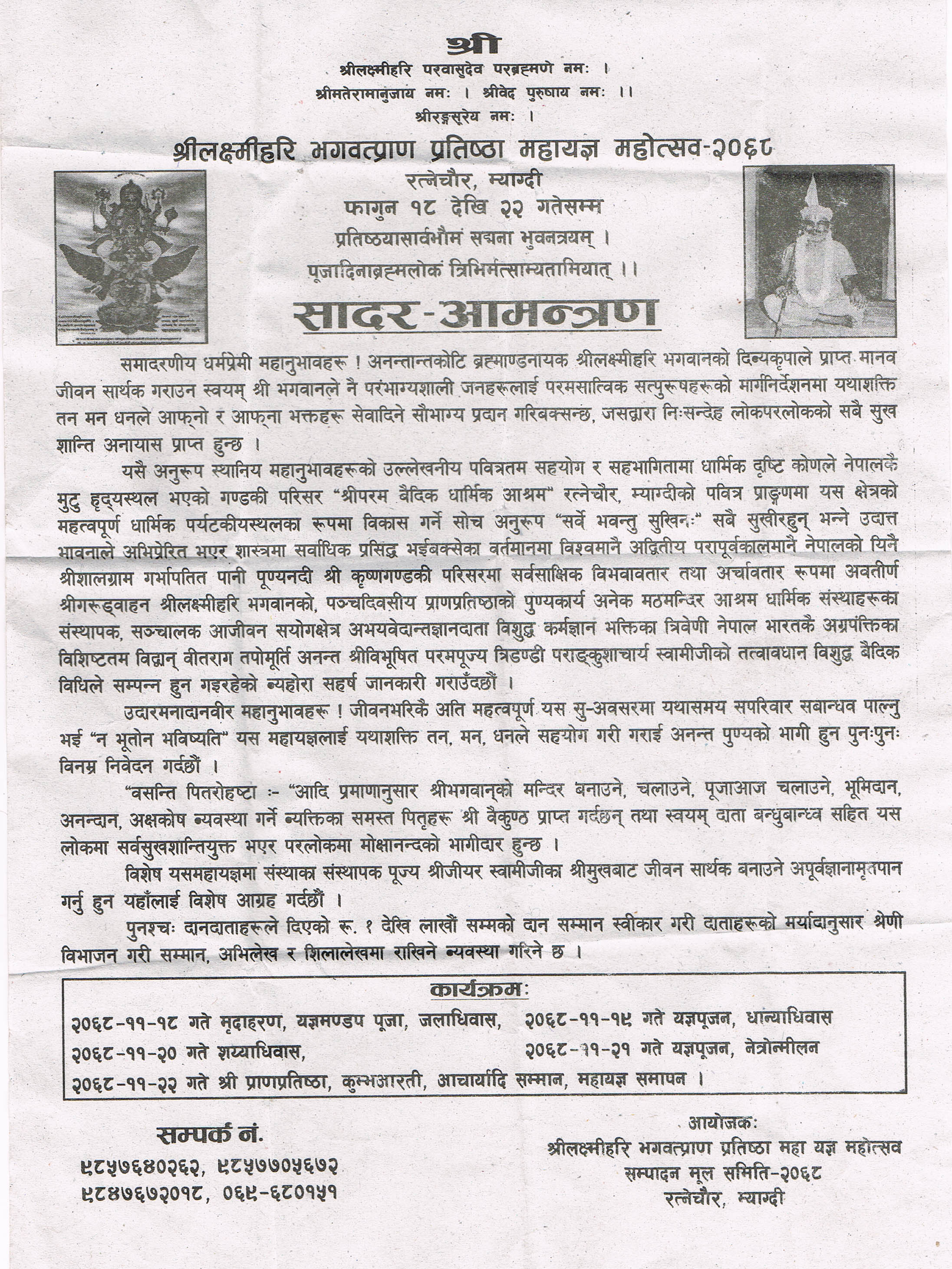 यदि यहाँहरू पनि यज्ञमा गच्छेअनुसार सहयोग गरी धार्मिक लाभ लिन चाहनु हुन्छ भने सम्पर्क गर्नुस तलका नम्बरहरूमा – ०६९-६८०१५१, ९८५७६४०२६२, ९८५७७०५६७२, ९८४७६७२०१८