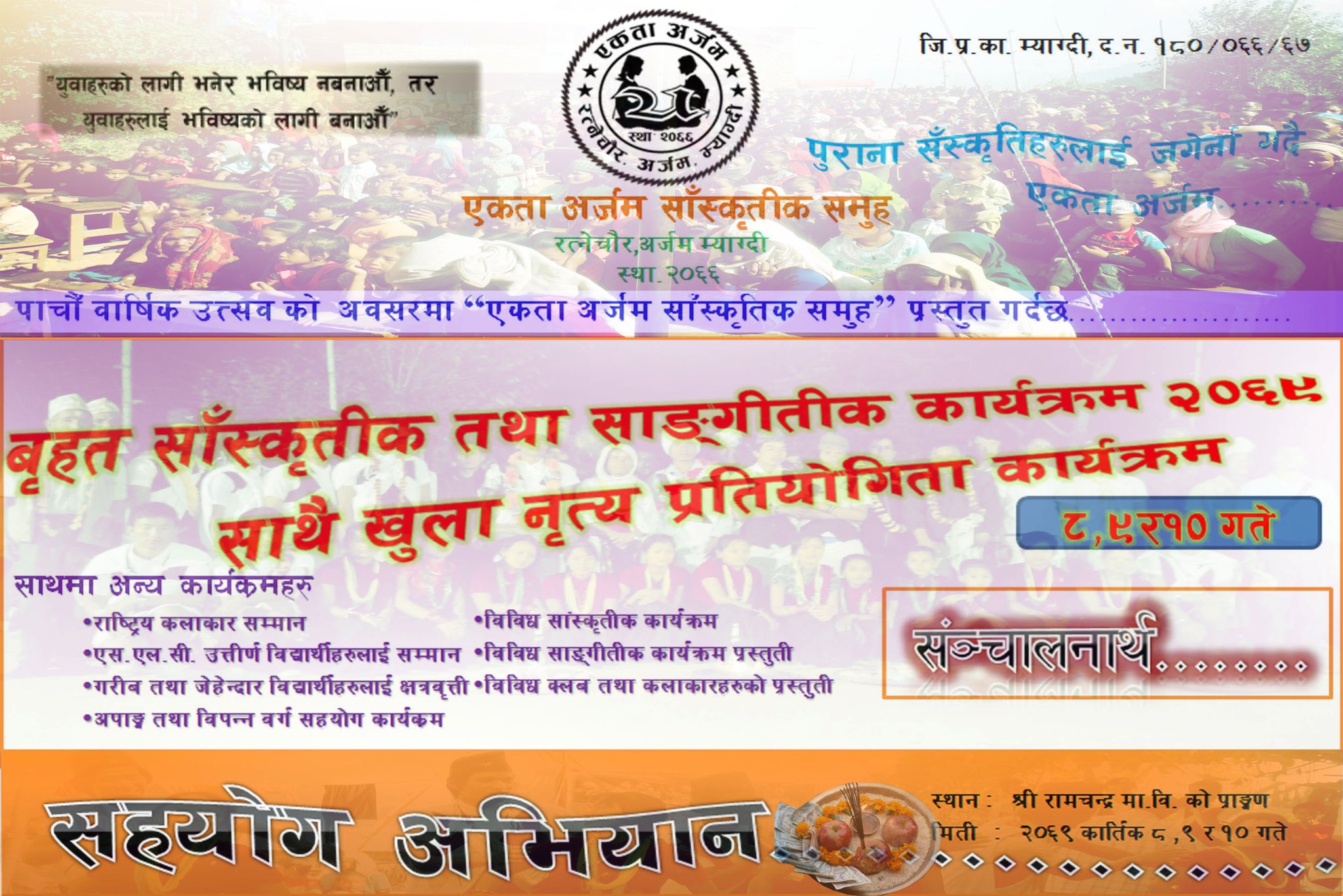 रत्नेचौर/अर्जम म्याग्दीमा स्थापित एकता अर्जम साँस्कृतीक समुह ले हरेक बर्ष जस्तै २०६९ सालको शुभ बिजया दशमीको पावन अवसरमा यहि कर्तिक ८,९ र १० गते वृहत साँस्कृतीक कार्यक्रम तथा एकल नृत्य प्रतियोगिता आयोजना गर्ने भएको छ। संस्थाको पाँचौ बार्षिकोत्सवका अबसरमा गर्न लागिएको ”वृहत साँस्कृतीक कार्यक्रम तथा एकल नित्य प्रतियोगिता” सञ्चालनार्थ सहयोग अभियान सुरु गरिएको छ। एकता अर्जम साँस्कृतीक समुहका संस्थापक अध्यक्ष रामचन्द्र थापा मगरको संयोजकत्वमा सहयोग अभियान सञ्चालन सुरु गरिएको सँस्थाका अध्यक्ष खकेन्द्र थापा मगरले बताउनु भएको छ। म्याग्दी जिल्ला रत्नेचौर गाबीस, अर्जममा आयोजना गरिने ३ दिने कार्यक्रममा विविध साँस्कृतिक कार्यक्रम, साङ्गितिक कार्यक्रम, एकल नित्य प्रतियोगिता, एस एल सी उतिर्ण बिधार्थीहरुलाई सम्मान, पोखरेली कलाकारहरु को बिषेश प्रस्तुती, म्याग्दी जिल्लाबाट बिषेश पहिचान बनाउन सफल राष्टिय कलाकारहरु लाई सम्मान, राष्टिय तथा स्थानिय लोकदोहोरी गायक गायिकाहरुको प्रस्तुति तथा जेष्ठ नागरिक सम्मान कार्यक्रम रहनेकुरा अध्यक्ष खगेन्द्र थापा मगरले बताउनु भएको छ।